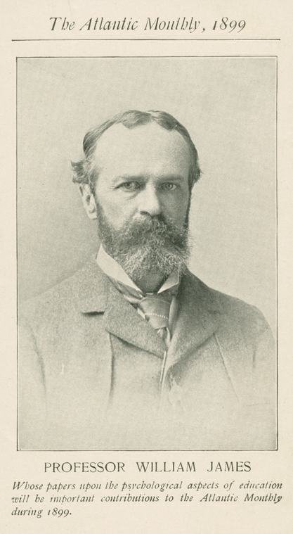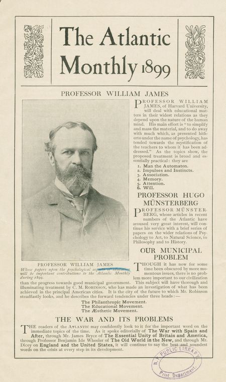 The following images show, respectively, a photograph of William James signed by him, most likely in the cover of a book, and two newspaper clippings from The Atlantic Monthly, from 1899, discussing the material taught by James at Harvard at the time:
